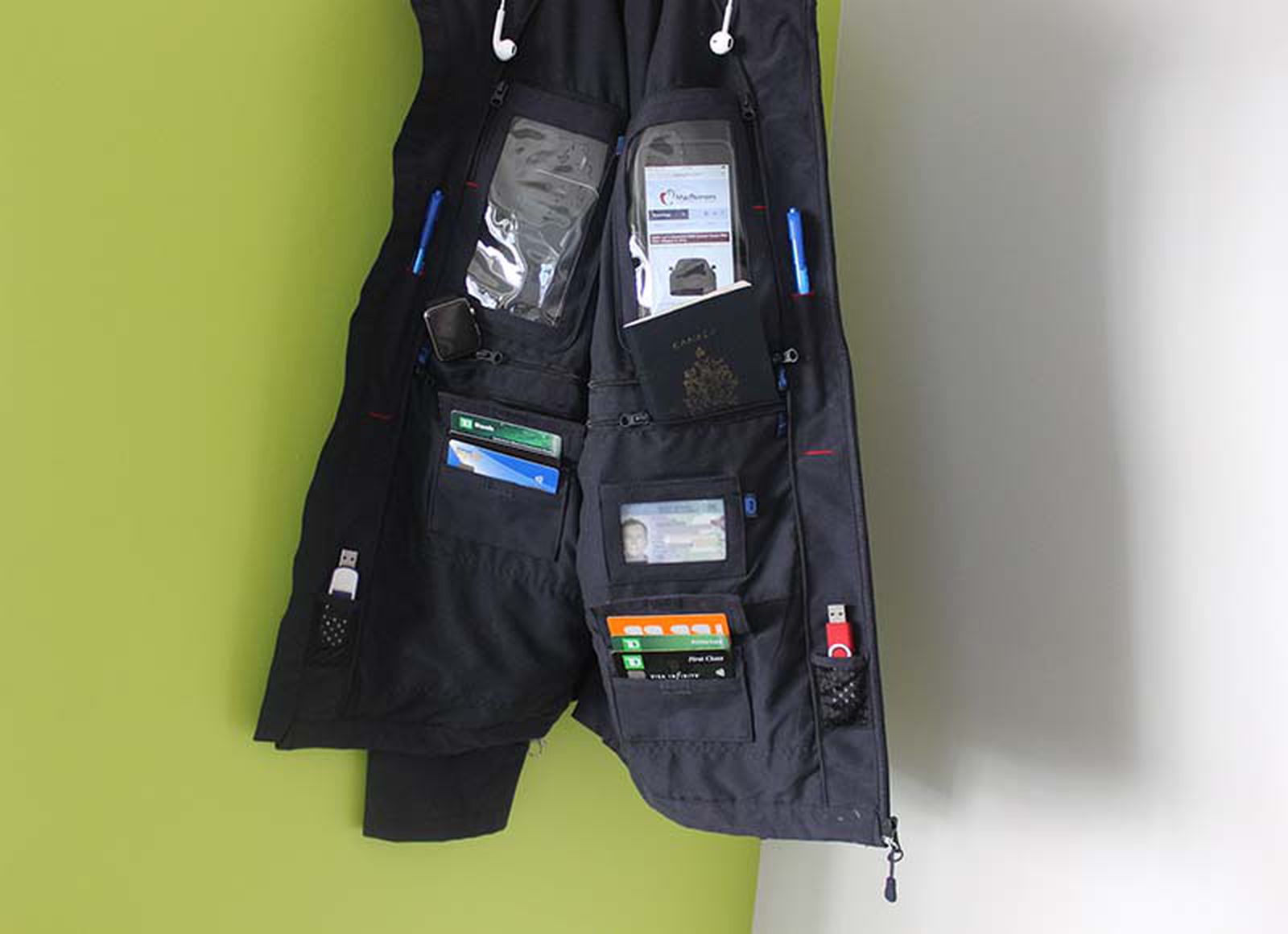 The jacket has more than 25 separate compartments for storing portable devices, valuables, travel essentials and general items, including six credit card and ID holders, two hand pockets, two chest pockets, two sleeve pockets, two smartphone pockets, two tablet pockets, two Pen holder, two coin holders, two memory stick holders, two SD card holders, a rear laptop pocket and a passport holder.